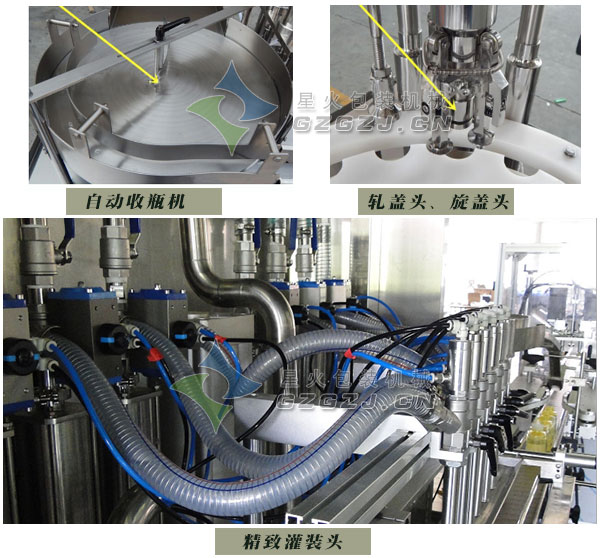 9、采用防滴漏與拉絲的灌裝悶頭、防高泡產品的灌裝升降系統、確保瓶口定位的定位系統和液位控制系統。